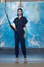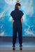 Elasticated waist. There are two pockets on the front. Short sleeves.