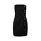 Introducing the epitome of sophistication and allure - our strapless mini dress in timeless black with delicate silver lines and sparkling buttons. This dress is a vision of elegance and style.