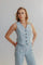 This chic light blue waistcoat for women is crafted from a denim-like fabric. Featuring four buttons, decorative pockets, and a fully lined interior, this versatile piece pairs perfectly with the matching light blue ladies' trousers (sold separately) for an complete, coordinated set. Ideal for both casual and formal occasions.