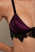 Le soutien-gorge Maria est fait de satin violet et de dentelle. Il est triangulaire avec deux élastiques à l'arrière.