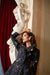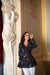 This black jacket features a stunning floral print with delicate white, blue, red, and lilac flowers, scattered with white polka dots like stars in the night sky. The double-breasted design adds a classic touch, while the detachable and adjustable hood lets you customize your look. Lined with luxurious black Italian satin, this coat combines vintage charm with modern style, making it a dreamy choice for anyone who loves beautiful, detailed design.