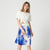 This midi pleated skirt is a signature piece, crafted from 100% recycled polyester and detailed with a lively floral print that brings movement and charm to every step. Its elasticated high waist and flowing pleats offer both comfort and elegance — a perfect blend of romance and conscious design.
