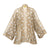 Striking piece that exudes both elegance and a touch of whimsy. The kaftan features a golden shimmering mesh fabric that glistens with every movement, creating a dazzling effect. Adorning this luxurious fabric are delicate silver stars, which add a celestial charm and make the kaftan perfect for special occasions. The short kimono style provides a contemporary twist to the traditional kaftan, offering a versatile and chic silhouette. This piece is ideal for those who want to make a bold statement while maintaining an air of sophistication.