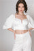 Sexy, playful, chic and totally in fashion! This white crop top will be the perfect detail for all your outfits. Whether pairing it with "On the Rocks" trousers or your favourite pair of jeans guarantees incredible nights out! Featuring stunning puffed shoulder details, this top will become your best friend day and night.