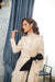 The coat features a beautiful beige color and an A-line cut, complemented by a black belt that ties into a sophisticated bow, elegantly accentuating your waist. The double-breasted design adds a classic touch, and the detachable, adjustable hood lets you change your look. Lined with soft light beige Italian satin, this coat is luxurious and practical, made from waterproof fabric to keep you dry while offering warmth and breathability for any occasion.