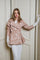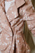 This short double-breasted jacket is in a soft beige-pink shade with a white flower leaf print and matching beige satin lining. Its detachable hood can be easily removed with push buttons, making it perfect for changing weather. Feel stylish and prepared for any weather as you enjoy the beautiful simplicity of this water-resistant jacket throughout the seasons.