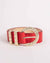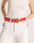 Erini belt - Red is a stunningly simple accessory that boasts a wide silhouette and a shining ornate buckle. Handcrafted from premium textured grain leather, this elegant belt is both stylish and practical, perfect for pairing with crisp white shirts or your favorite jeans. Its width ensures a seamless fit through any belt loop, making it a versatile addition to your collection. Elevate your fashion game with this timeless and minimalist accessory.