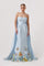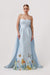 The Jasmine Gown in light blue is a strapless masterpiece that exudes sophistication and charm. Cut at the waist to flatter your figure, this gown features a unique garden/floral print on the hem for a whimsical touch. The standout feature is the removable statement cape, allowing you to customize your look for any special occasion. Perfect for making a lasting impression, the Jasmine Gown combines elegance with a dreamy, modern twist.