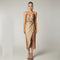Uchwyć urzekający blask w naszej długiej sukience Ariel Gold Sequin. Ta pozycja ma dopasowany gorset, długi dół, wysokiej jakości ozdoby z cekinów i odważne rozcięcie z przodu