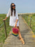 Ręcznie tkana torba z kolorowej naturalnej rafii, okrągła drewniana rączka.