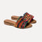 Klapki skórzane z wielobarwną rafią tkaną na ręcznie robionym krośnie.
