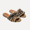 Klapki skórzane z dwukolorową rafią tkaną na ręcznie robionym krośnie.