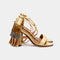 Sandały na obcasie z frędzlami na pięcie w kolorach złota i brązu.