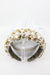 Korona jest pokryta efektownym, złocistym materiałem i jest wyściełana dla dodatkowego efektu. Korona jest bogato zdobiona kryształami Swarovskiego, perłami słodkowodnymi i olśniewającymi koralikami. Do opaski przymocowano również małą okrągłą metalową etykietę z logo i etykietę z imieniem. Dwa małe metalowe grzebienie do włosów zapewnią czepcowi dodatkowe wsparcie podczas noszenia.