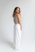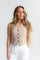 Ta stylowa kremowa kamizelka damska ma cztery guziki i ozdobne kieszenie. Wykonana z materiału przypominającego denim z całkowicie podszytym wnętrzem, ta elastyczna część pięknie komponuje się z pasującymi kremowymi spodniami dla kobiet , sprzedawanymi oddzielnie. Idealna zarówno na co dzień, jak i na formalne okazje.