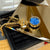 Szkło powiększające, stal nierdzewna pozłacana 18-karatowym złotem, malowane niebieskie kamienie.