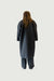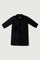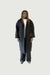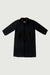 Jego długi krój i czarna wełna dopasowują się do każdej sylwetki. Wnętrze ze sztucznego futra otula ciało ciepłem, a zaokrąglone rękawy i ramiona podkreślają efekt kokonu.