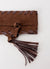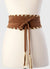 Ręcznie robiony boho-chicowy pasek z zamszu, wykonany w naszym atelier z miękkiej i elastycznej naturalnej skóry. Maksymalna szerokość wynosi 9,5 centymetra, a pasek posiada dwie skórzane paski do wiązania, zakończone frędzlami z kółeczkami. Ten boho-pasek dodatkowo podkreśla swój urok dzięki krawędziom ozdobionym pasem skóry w tym samym kolorze. To idealny pasek z frędzlami, który ożywi Twoją garderobę, pasując do bluzek, spodni, tunik, spódnic, dżinsów, długich koszul i wszelkiego rodzaju strojów.
