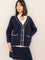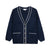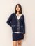 Granatowy krój z białymi wykończeniami tworzy elegancki i ponadczasowy kontrast. Luźny krój i kieszenie z przodu sprawiają, że jest to uniwersalny element garderoby, który sprawdzi się zarówno w swobodnych, jak i formalnych stylizacjach.