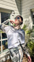 Jasny biały gorset pięknie kontrastuje z misternym nadrukiem, który rozciąga się wzdłuż rękawów, a eleganckie czarne sznurówki subtelnie krzyżują się na zakrytym dekolcie, dodając szyku i wyrafinowania.