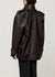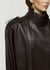 Ten czekoladowy, dwurzędowy żakiet ma luźny krój, dwie nakładane kieszenie, zapinanie na guziki i podkreślone, obfite ramiona.
