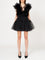 Ta suknia zachwyca swoją obszerną mini sylwetką, wykonaną z falujących warstw tiulu. Projekt charakteryzuje się głębokim dekoltem w kształcie litery V, dodatkowo podkreślonym kaskadowymi falbanami, które wdzięcznie zdobią dekolt, tworząc czarujący efekt wizualny. Odważne odkryte plecy dodają element zaskoczenia, odsłaniając rozległość skóry i wzmacniając urok sukni.