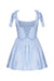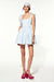 Nazlı Ceren stawia na poetycką nutę w tej błyszczącej wiskozowej sukience mini w kolorze niebieskim, której fason podkreślają drapowane ramiona i marszczona spódnica.