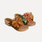 Materiały: detale ze skóry i naturalnych kwiatów rafii. Podeszwa z drewna olchowego wycięta i zmontowana w całości ręcznie. Skórzana część zewnętrzna i komfortowe rozdarcie. Podeszwa drewniana z gumowym bieżnikiem.