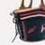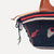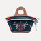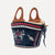 Materiały: dzianinowa część wykonana w 100% z bawełny, haftowana tym samym materiałem; Kolor tła - granatowy, czerwony i kremowy; Wewnętrzna torba z płótna pochodzącego z recyklingu: 70% bawełny/30% wiskozy; Metka skórzana i pasek na rękę w kolorze wielbłądzim.