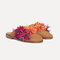 Klapki z ręcznie robionymi aplikacjami z wielobarwnych kwiatów naturalnej rafii i grzechotek.