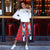 Połącz go z naszą białą bluzą z falbanką i haftowanym motywem oczu, aby uzyskać sportową, a zarazem elegancką kombinację.
