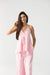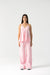 Ten stylowy dwuczęściowy komplet zawiera cienki, bez ramiączek top, który wiąże się na szyi i ma delikatny dekolt w serek. Top swobodnie opada na ciało, zapewniając swobodny, kobiecy krój. Dopasowane spodnie o szerokich nogawkach mają prosty, luźny krój, który zapewnia komfort i nowoczesną sylwetkę. Łatwe do łączenia i dopasowywania, oba elementy można nosić razem lub stylizować osobno z ulubionymi elementami garderoby. Idealne na ciepłe dni, relaksacyjne wyjścia lub bezpretensjonalny styl na co dzień.