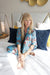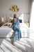 Poczuj urok niebieskiej, satynowej krótkiej szaty z długim rękawem i nadrukiem liści. Ten wyjątkowy egzemplarz łączy w sobie wyrafinowanie satyny z urzekającym niebieskim kwiatowym nadrukiem liści. Długie rękawy i krótka sylwetka emanują elegancją, dzięki czemu są idealnym wyborem na chwile relaksu przepełnione stylem.