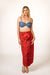 Introducing "Eva," a captivating skirt crafted from exquisite custom-printed chiffon. This vibrant red masterpiece is a true celebration of color and style, designed to make you the envy of any beach or resort. The luxurious chiffon fabric flows effortlessly, creating a graceful and romantic silhouette that dances with every movement. The unique print, wrap around skirt with bespoke red pipping design running through adding exclusively to this skirt, adds a touch of artistry and individuality with feather and silk flower attached making it one of a kind. Eva is the perfect companion for sunny days by the sea. Pair it with the Eva bralette, a simple white tank top, a colorful bandeau, or a breezy linen shirt for effortless chic. Let the skirt be the star of the show, whether you're strolling along the shoreline, enjoying a sunset cocktail, or dancing under the stars.