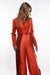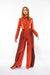 Introducing our vibrant geometric jumpsuit. The structured collar and long sleeves add a touch of sophistication, while the pleated side panels bring a unique flair to the wide-leg silhouette.
